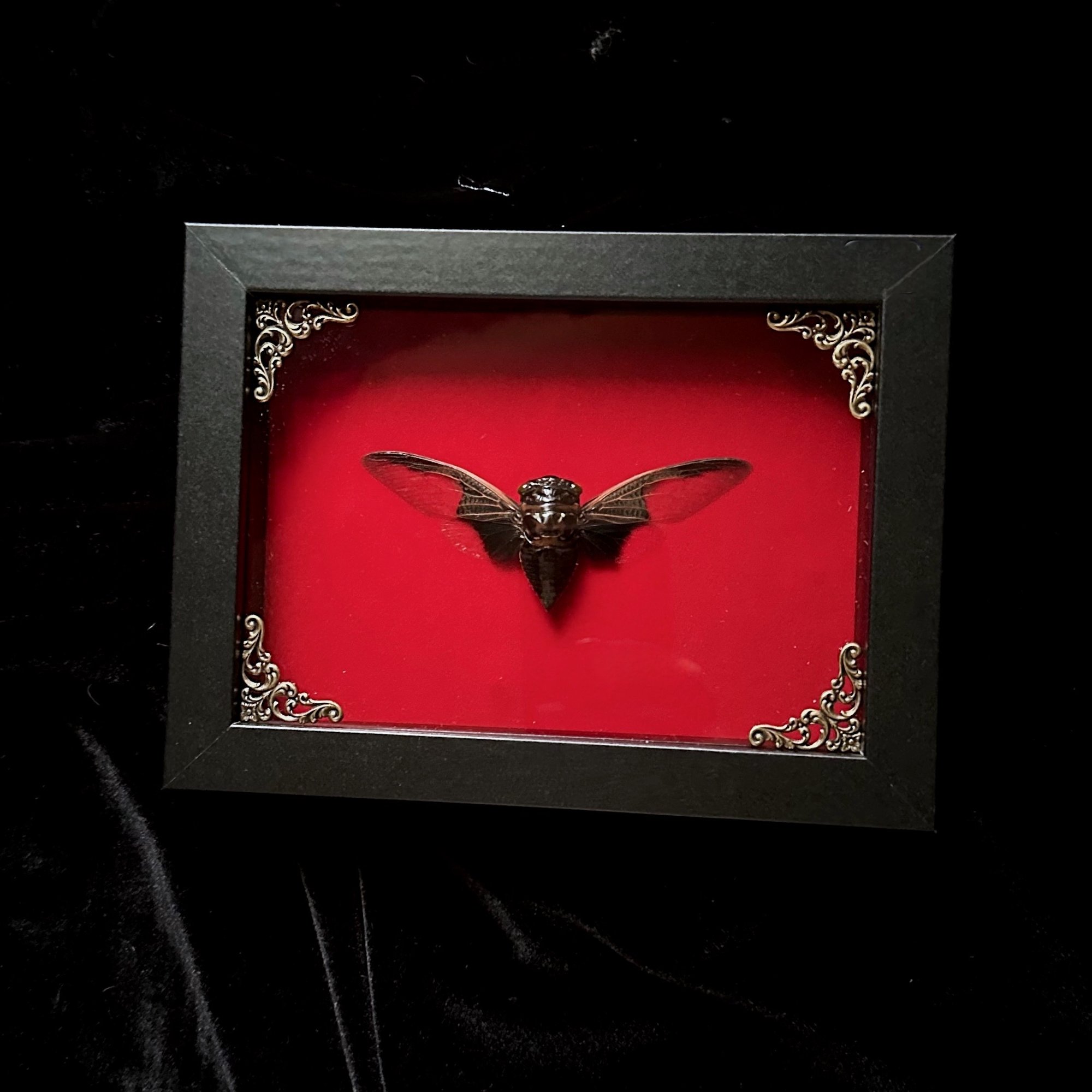 This listing includes a real Bat Wing Cicada mounted on a red velvet background in a 5x7 shadow box frame with antique bronze filigree corners.