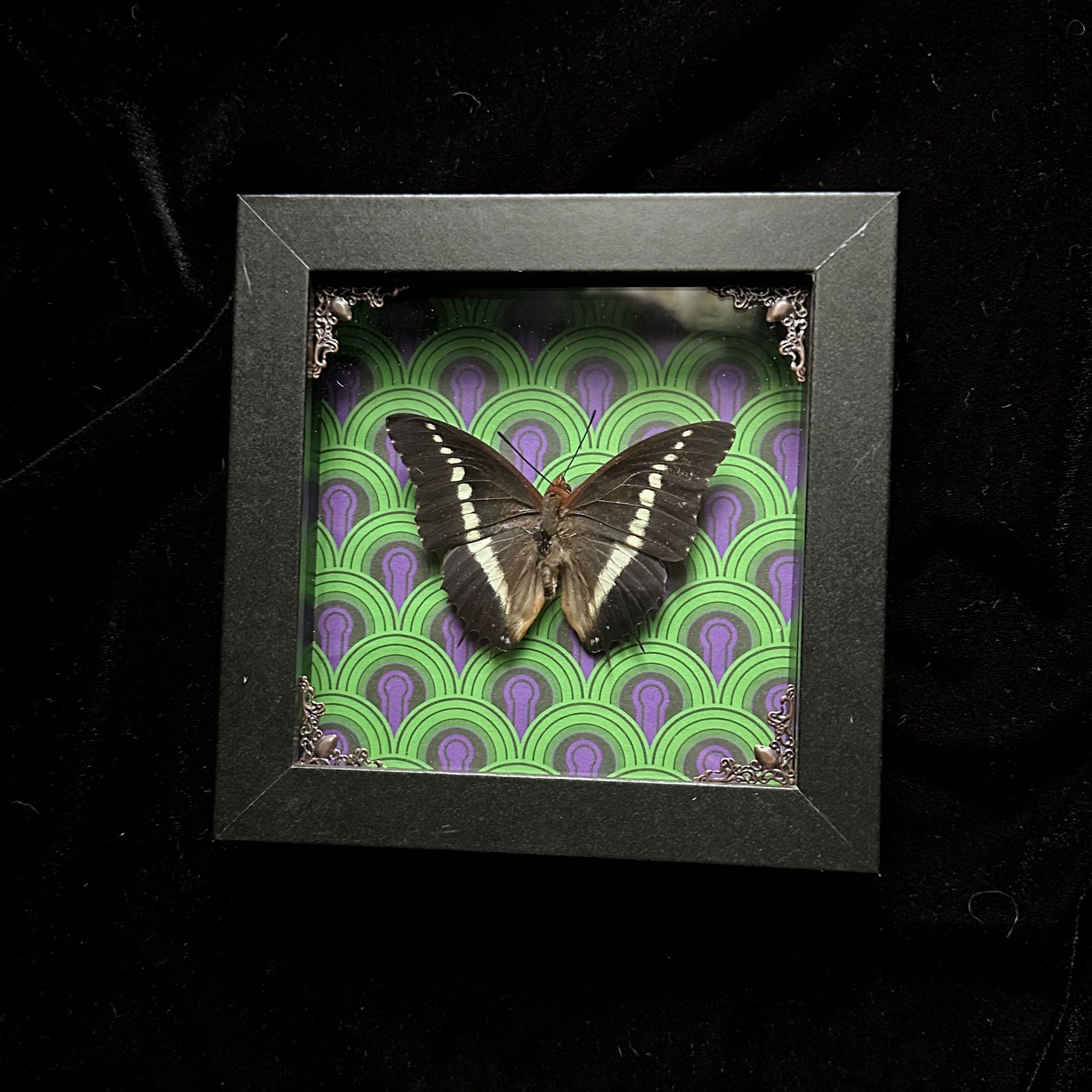 This listing includes a real Charaxes Brutus Butterfly mounted on the Room 237 carpet background from The Shining, in a 5x5 shadow box frame.
