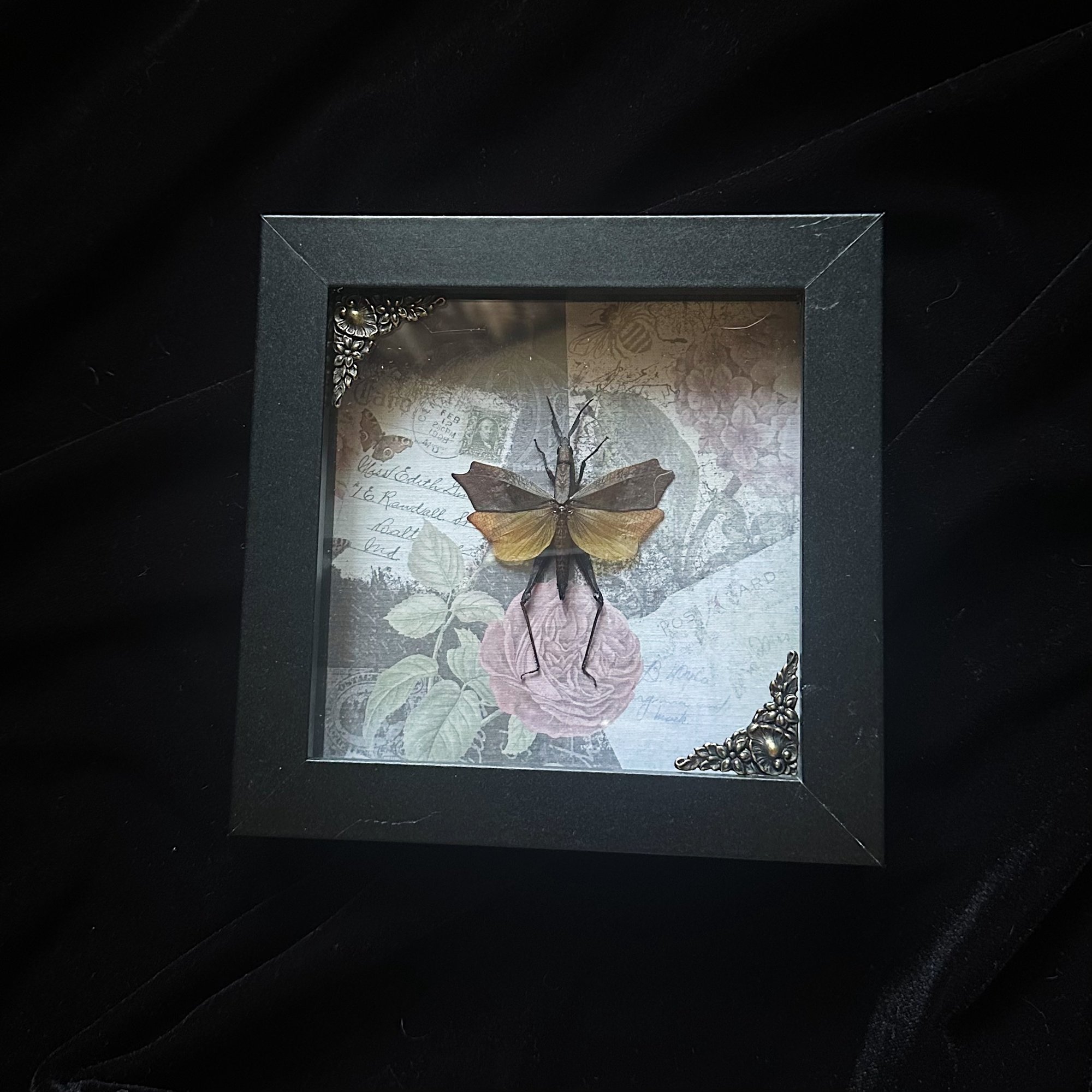 This listing includes a real Trigonopteryx Celebesia Grasshopper mounted on a vintage postcard background in a 5x5 shadow box frame.