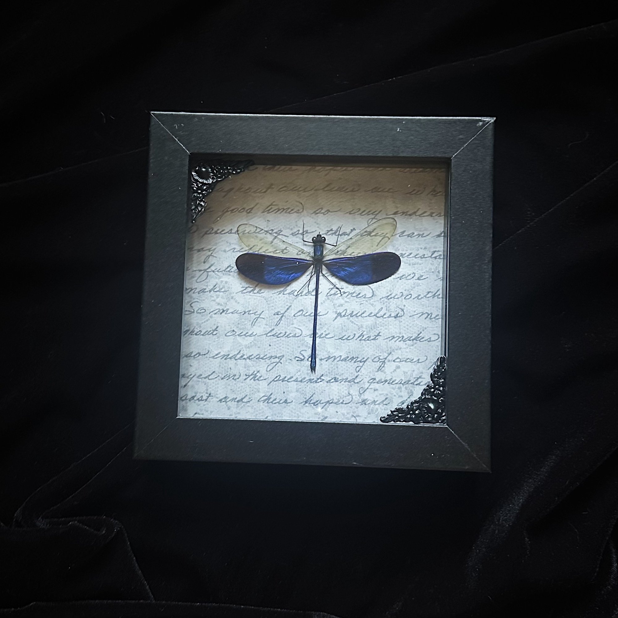 This listing includes a real Blue Metalwing Damselfly on a grey and white script background in a 5x5 shadow box frame with filigree corners.