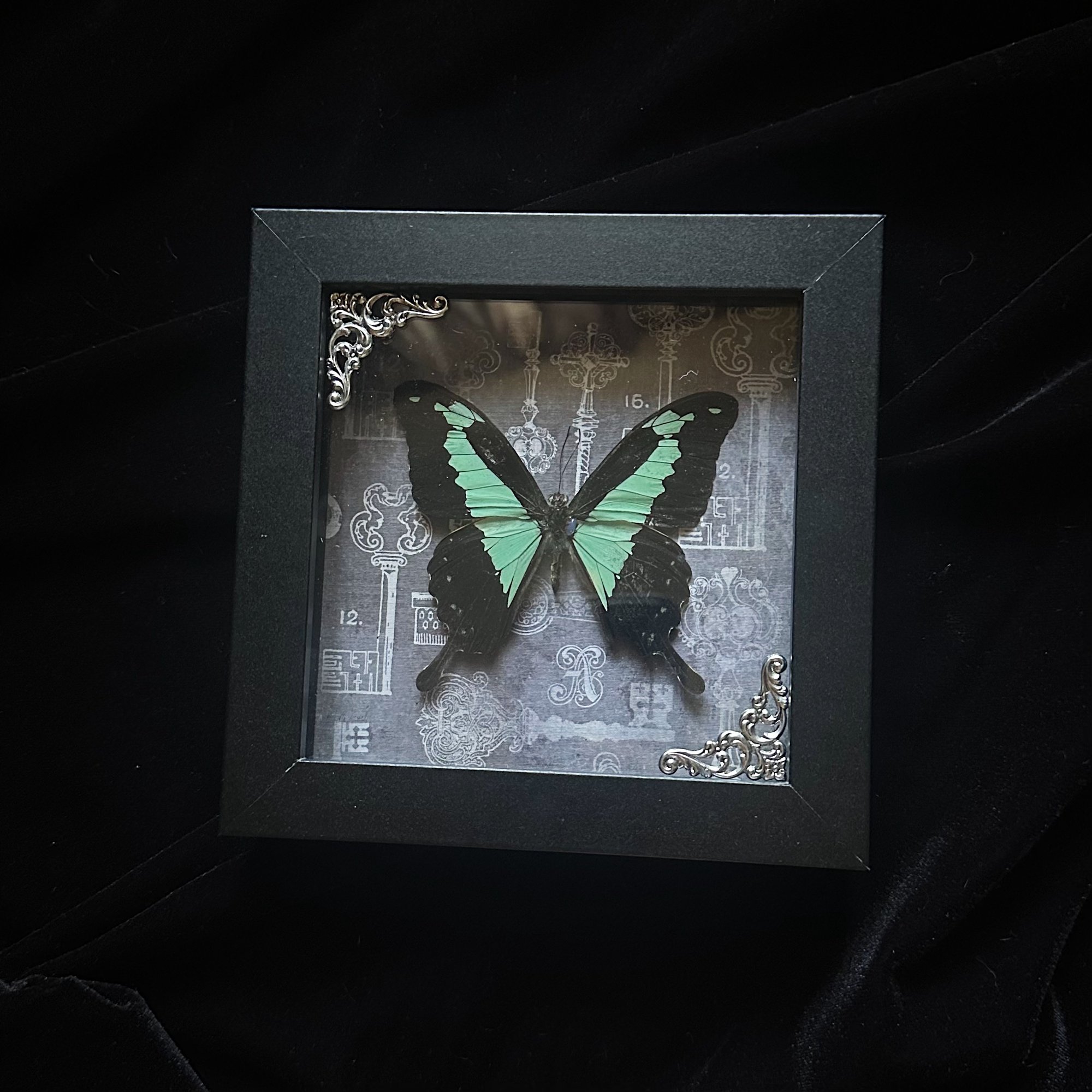 This listing includes a real Papilio phorcas Butterfly mounted on a grey skeleton keys background in a 5x5 shadow box frame with antique filigree corners.
