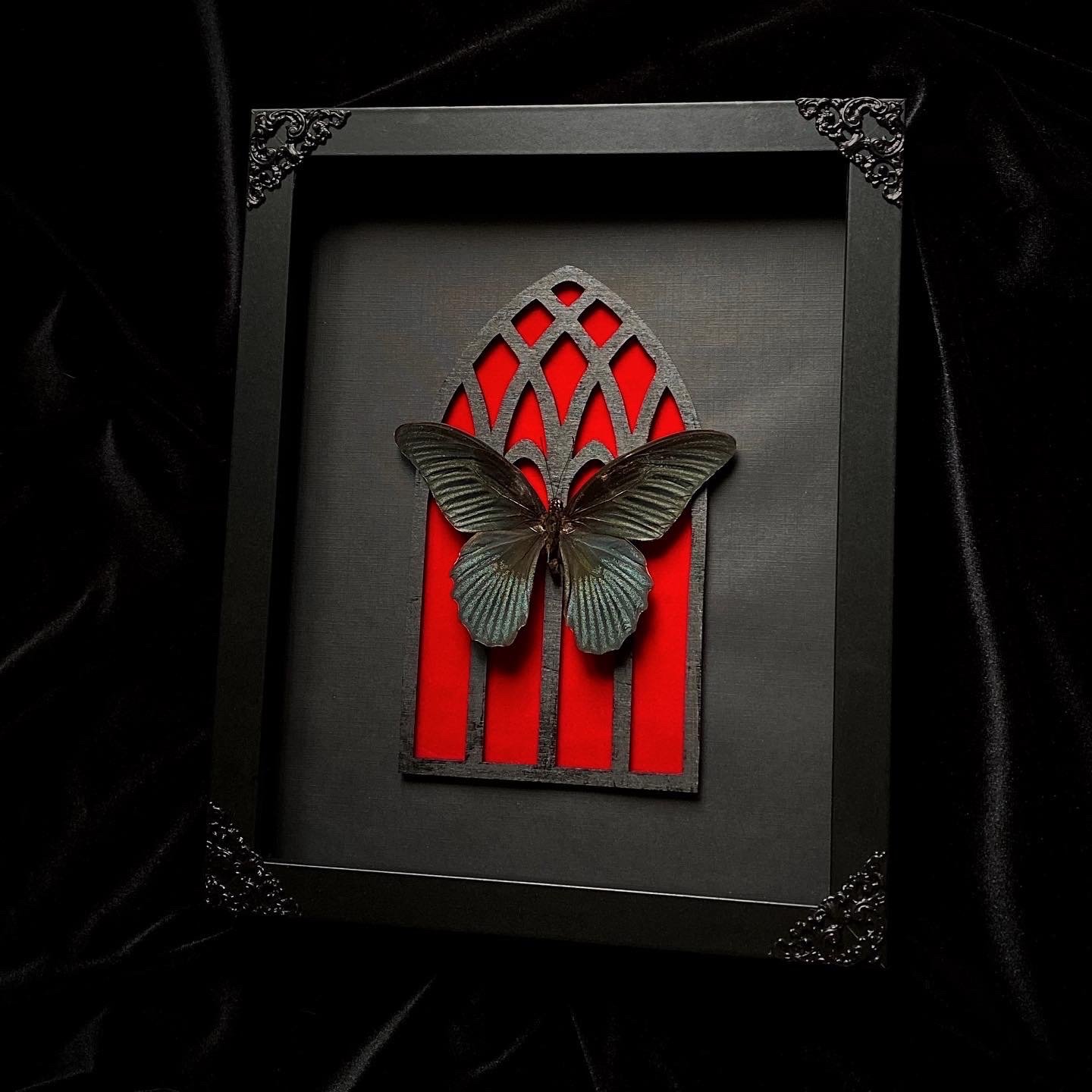 This listing includes a real Great Mormon Butterfly mounted on a Gothic Cathedral Arch with a red and black background in an 8x10 shadow box frame with black painted filigree corners.
