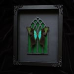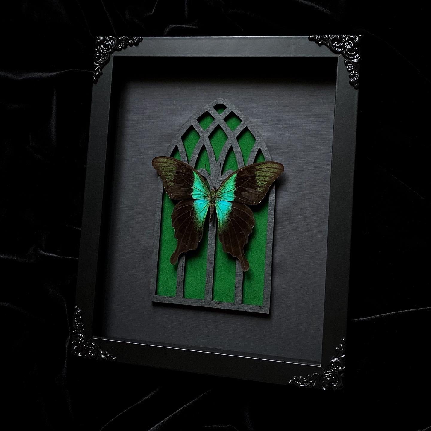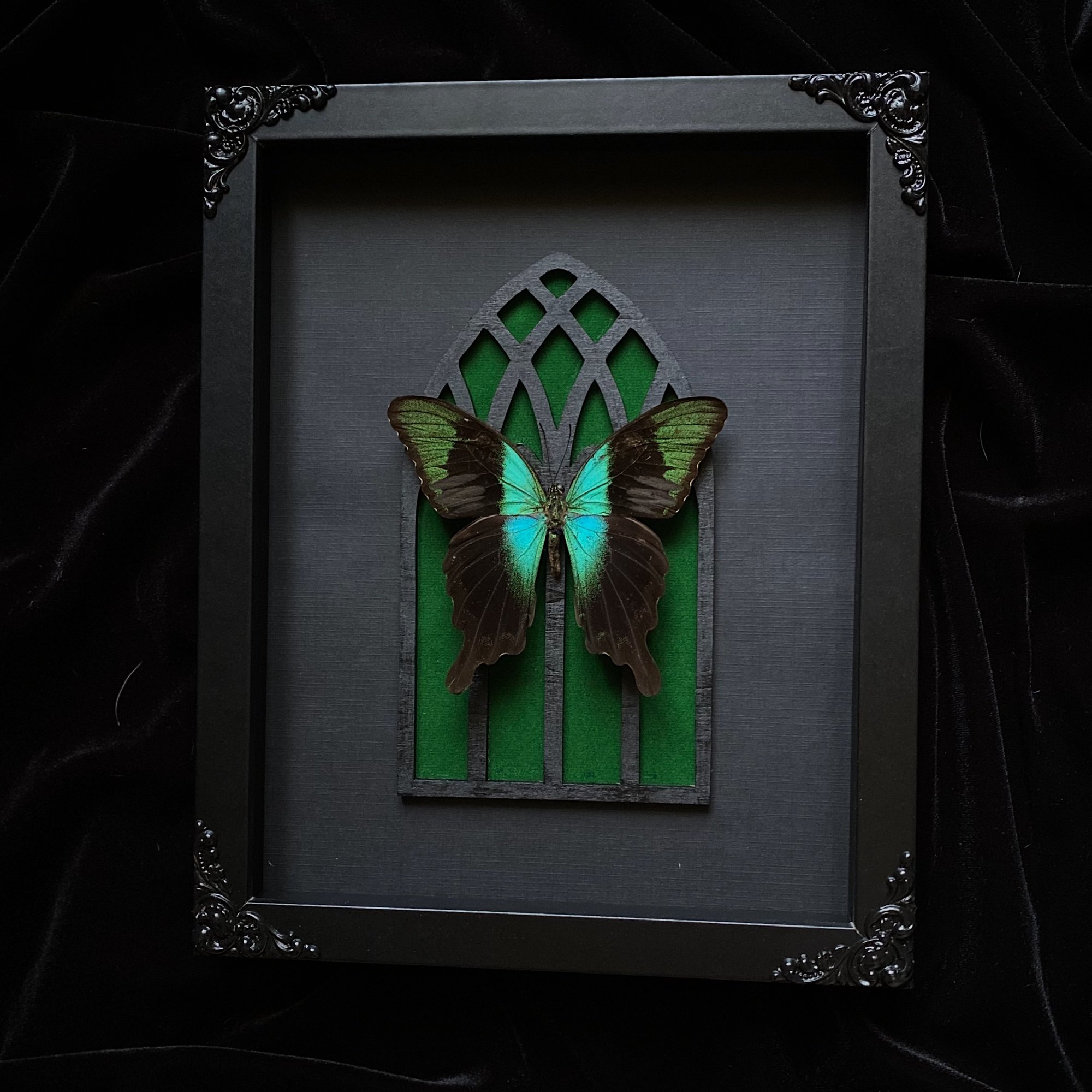 This listing includes a real Papilio Adamantius Swallowtail Butterfly mounted on a Gothic Cathedral Arch, with a white and black background, in an 8x10 shadow box frame with black painted filigree corners.