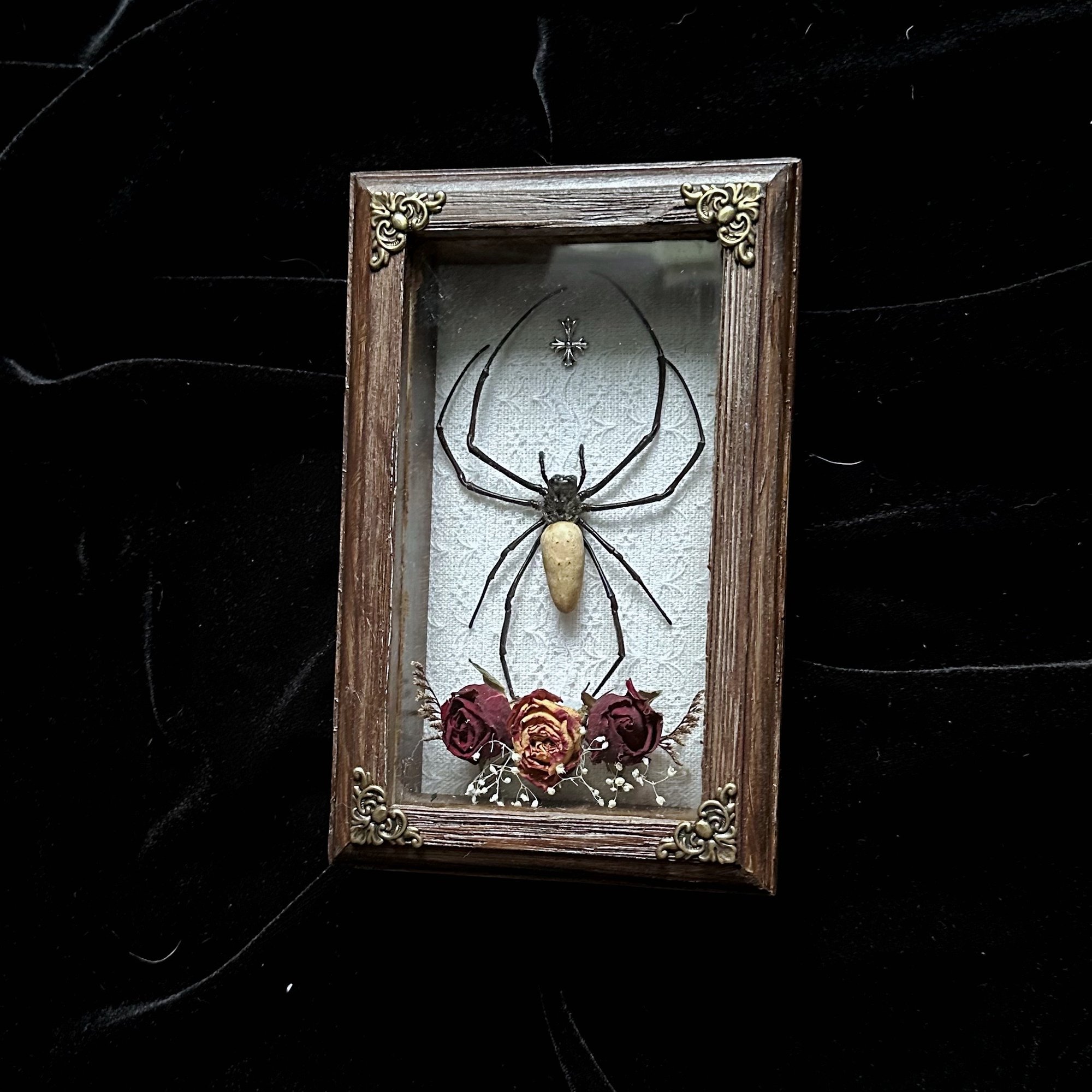 This listing includes a real Nephila Pilipes Orb Weaver Spider mounted on a white lace background, adorned with dried florals, and an inverted crucifix cross, in a wood stained vintage 3.5"x6" shadow box frame.