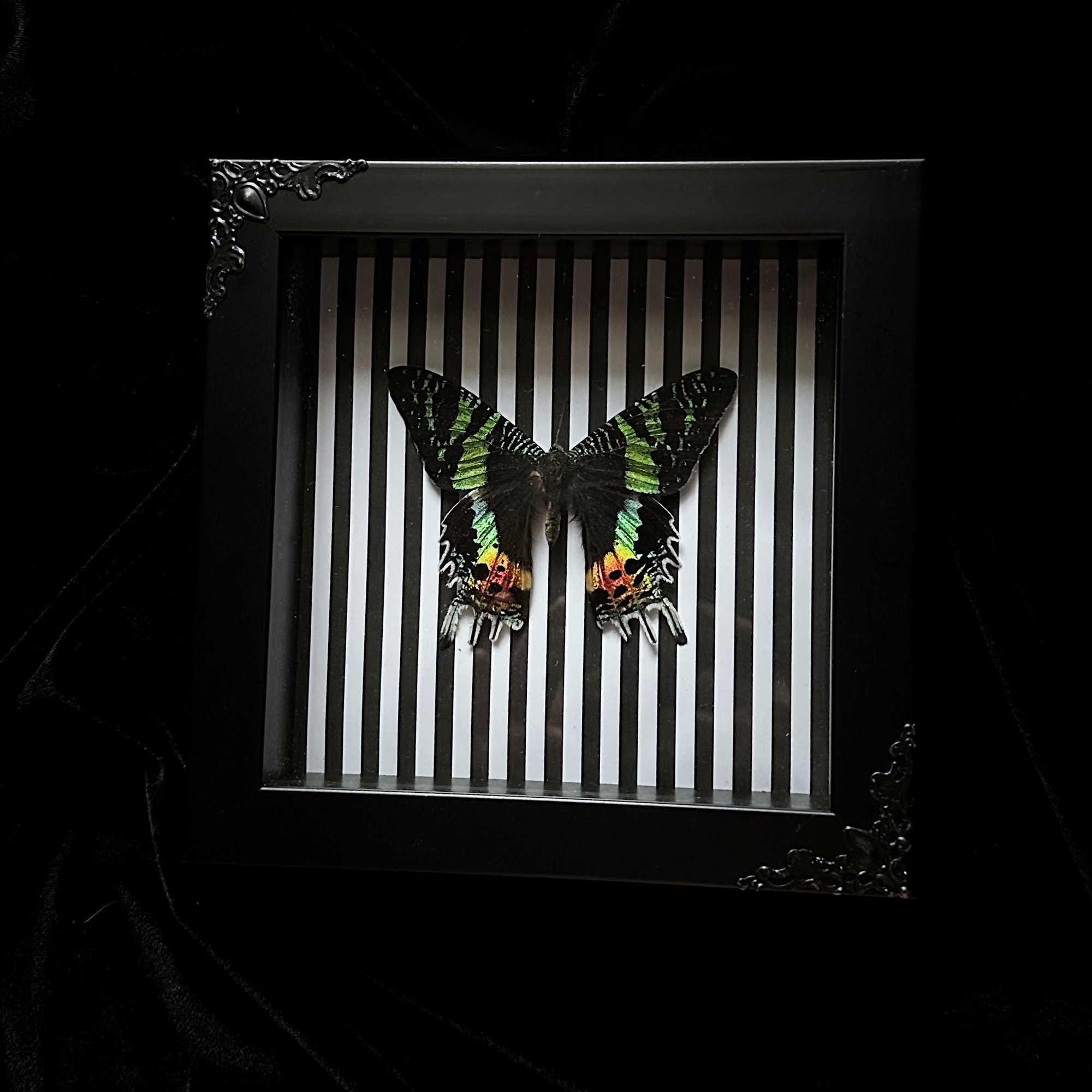 This listing includes a real Madagascar Sunset Moth mounted on a black and white striped background in a 6x6 shadow box frame with black filigree corners.