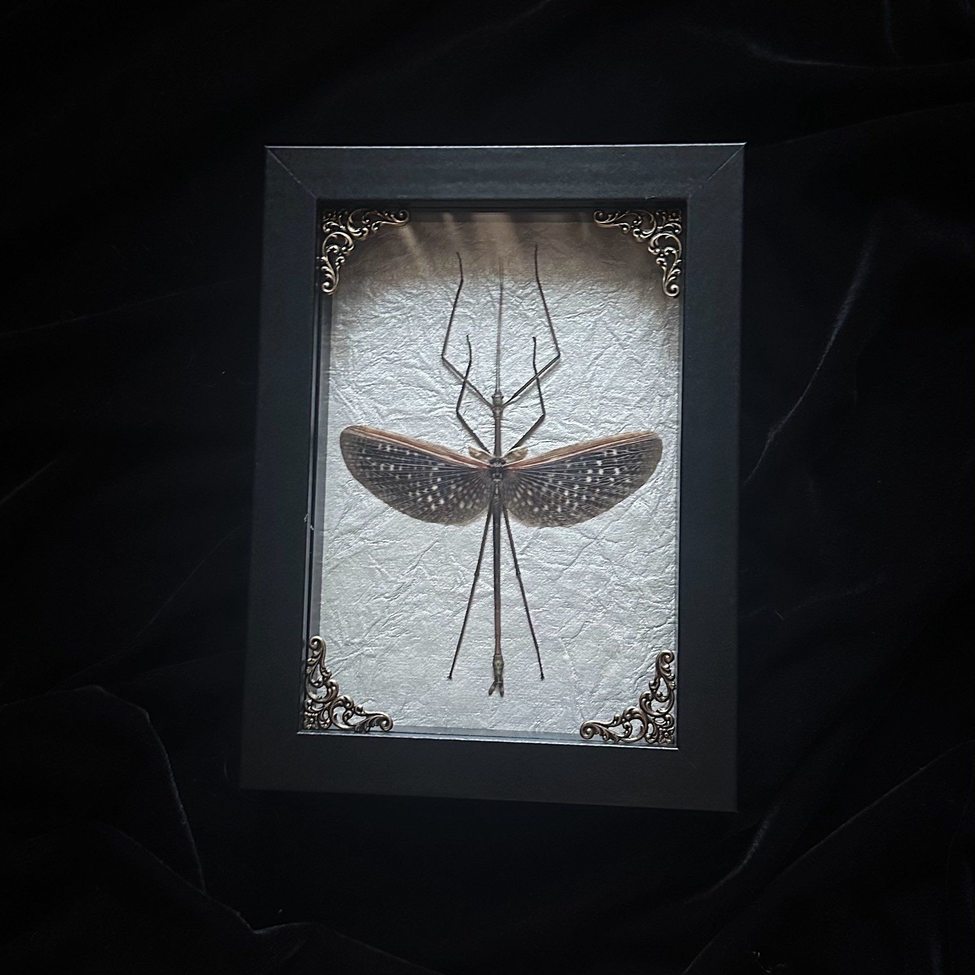 This listing includes a real Anchiale buruense Stick Insect mounted on a white crinkled background in a 5x7 shadow box frame with filigree corners.