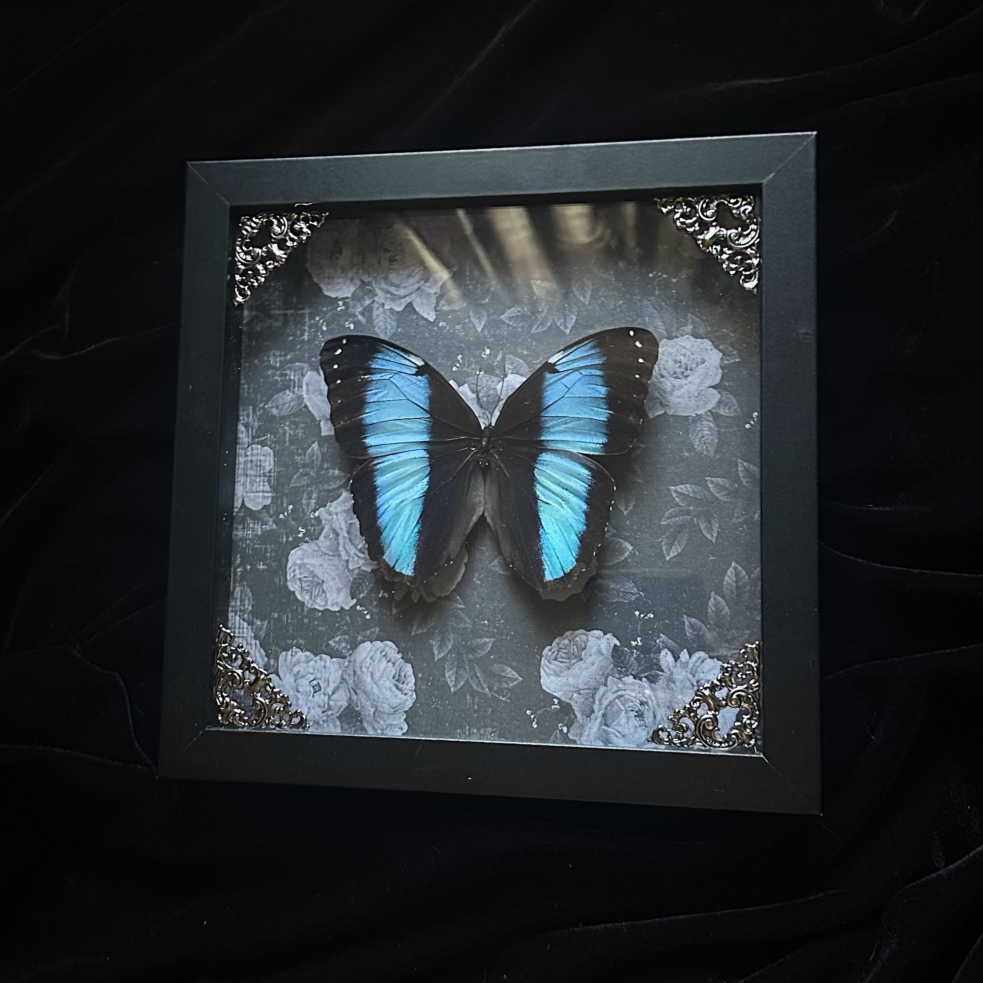 This listing includes a real Morpho Achilles Butterfly mounted on a vintage black floral background in an 8x8 shadow box frame with filigree corners