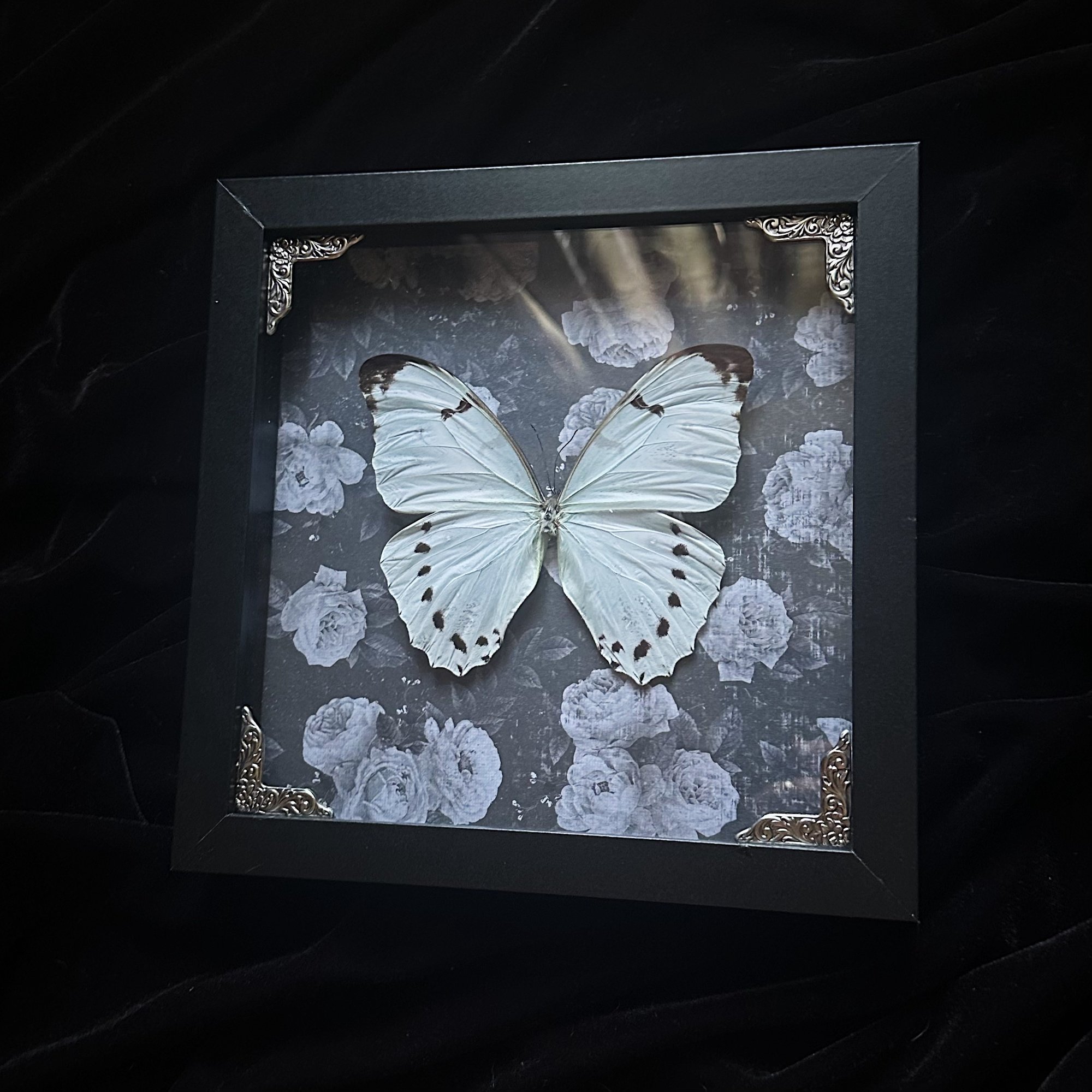 This listing includes a real Morpho Luna Butterfly mounted on a vintage black floral background in an 8x8 shadow box frame.