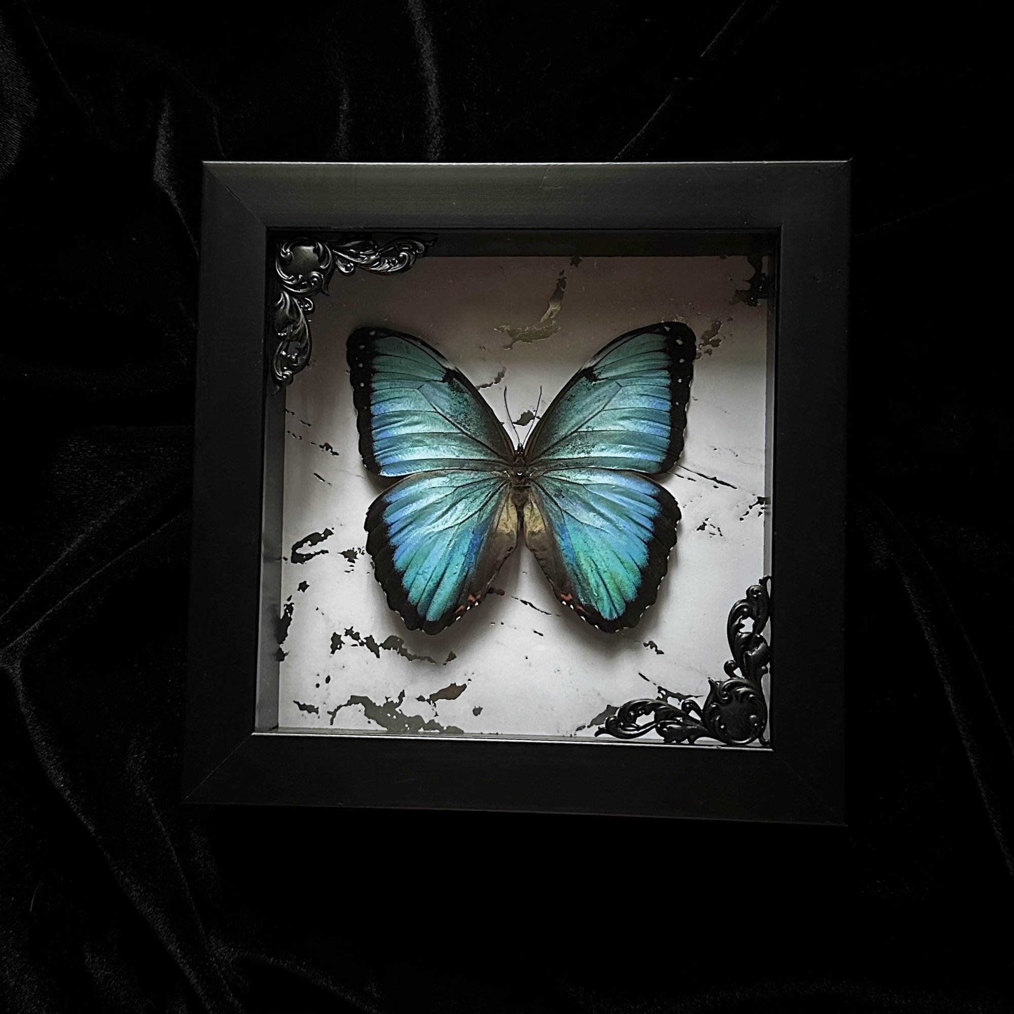 This listing includes a real Morpho Peleides Butterfly mounted on a white and silver marble background in a 6x6 shadow box frame with black painted filigree corners.