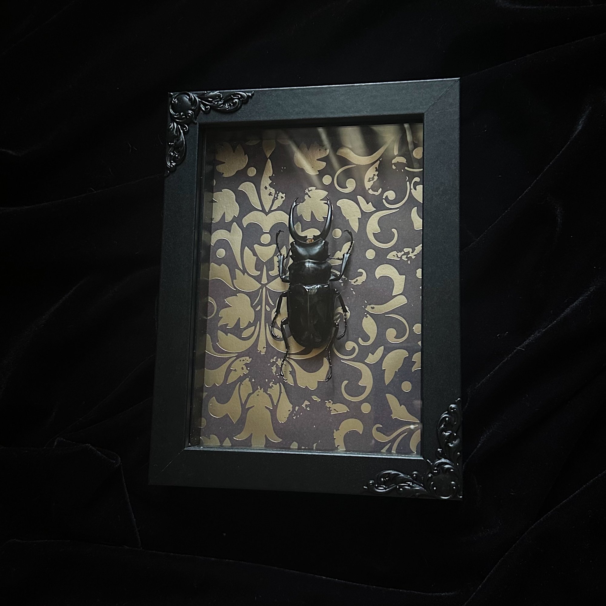 This listing includes a real Odontolabis celebensis stag beetle mounted on a grey and gold damask background in a5x7 shadow box frame with filigree corners.
