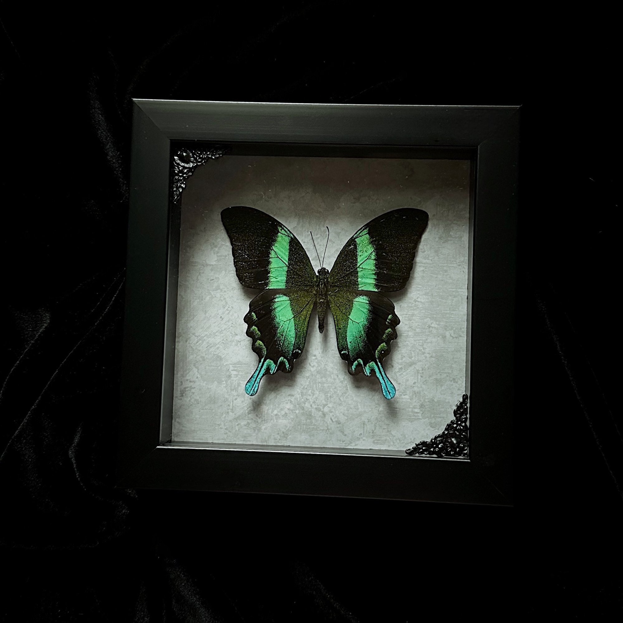 This listing includes a real Papilio Blumei Peacock Swallowtail Butterfly mounted on a light grey background in a 6x6 shadow box frame with filigree corners.