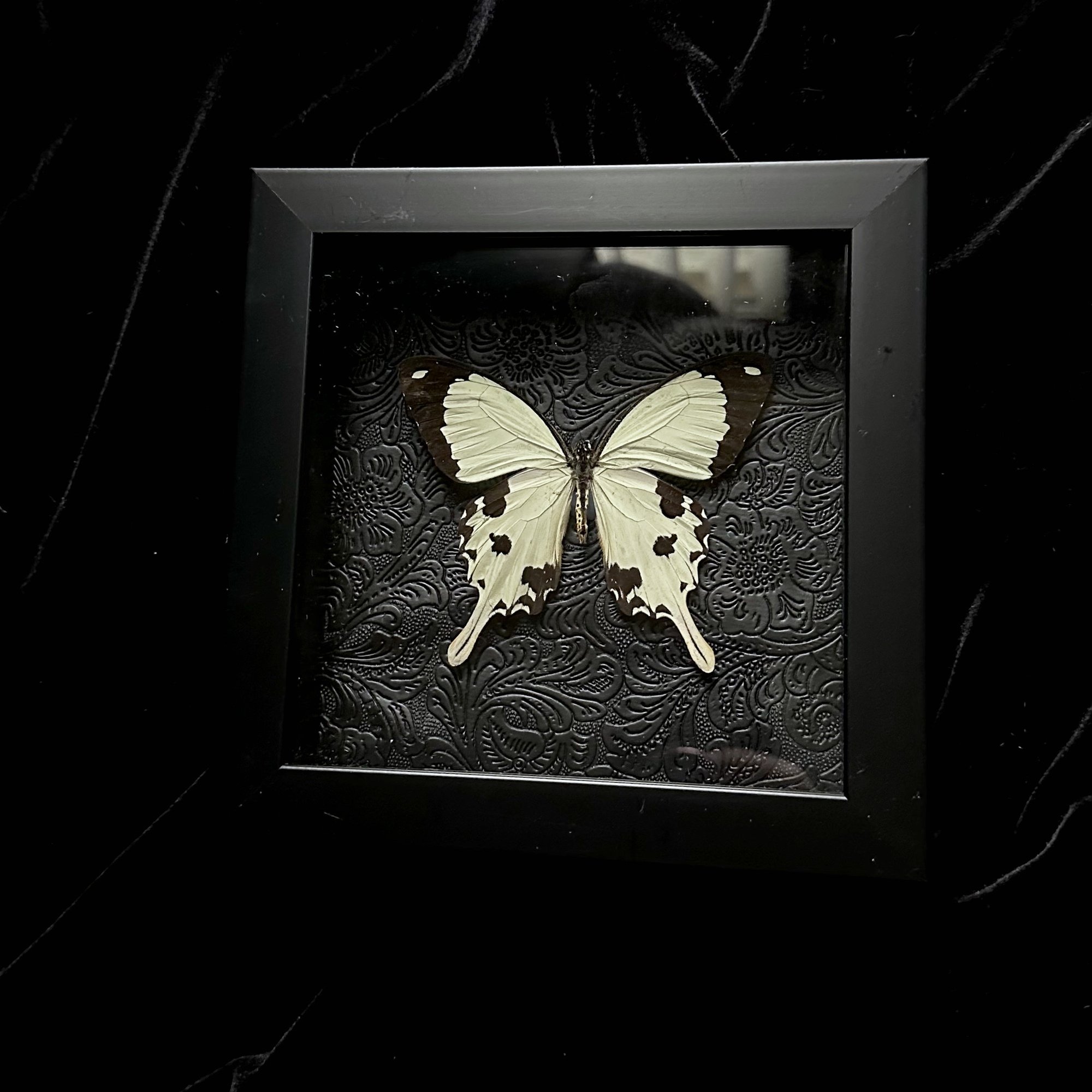 This listing includes a real Papilio Dardanus Butterfly mounted on a black floral embossed background, in a 6x6 shadow box frame.
