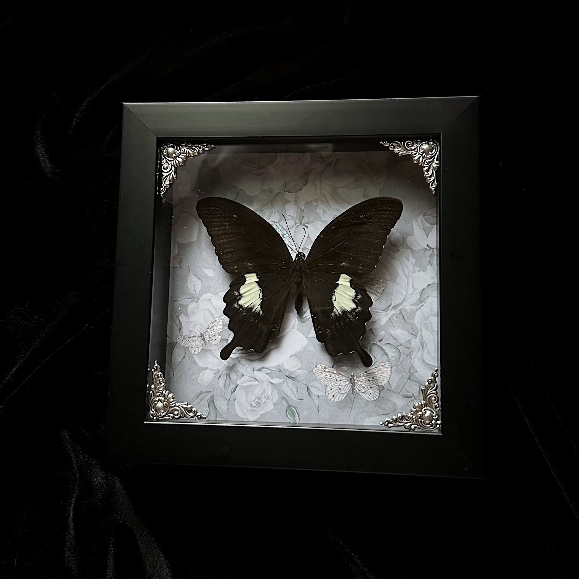 This listing includes a real Papilio Fuscus Butterfly mounted on a ghostly floral background in a 6x6 shadow box frame with silver filigree corners.
