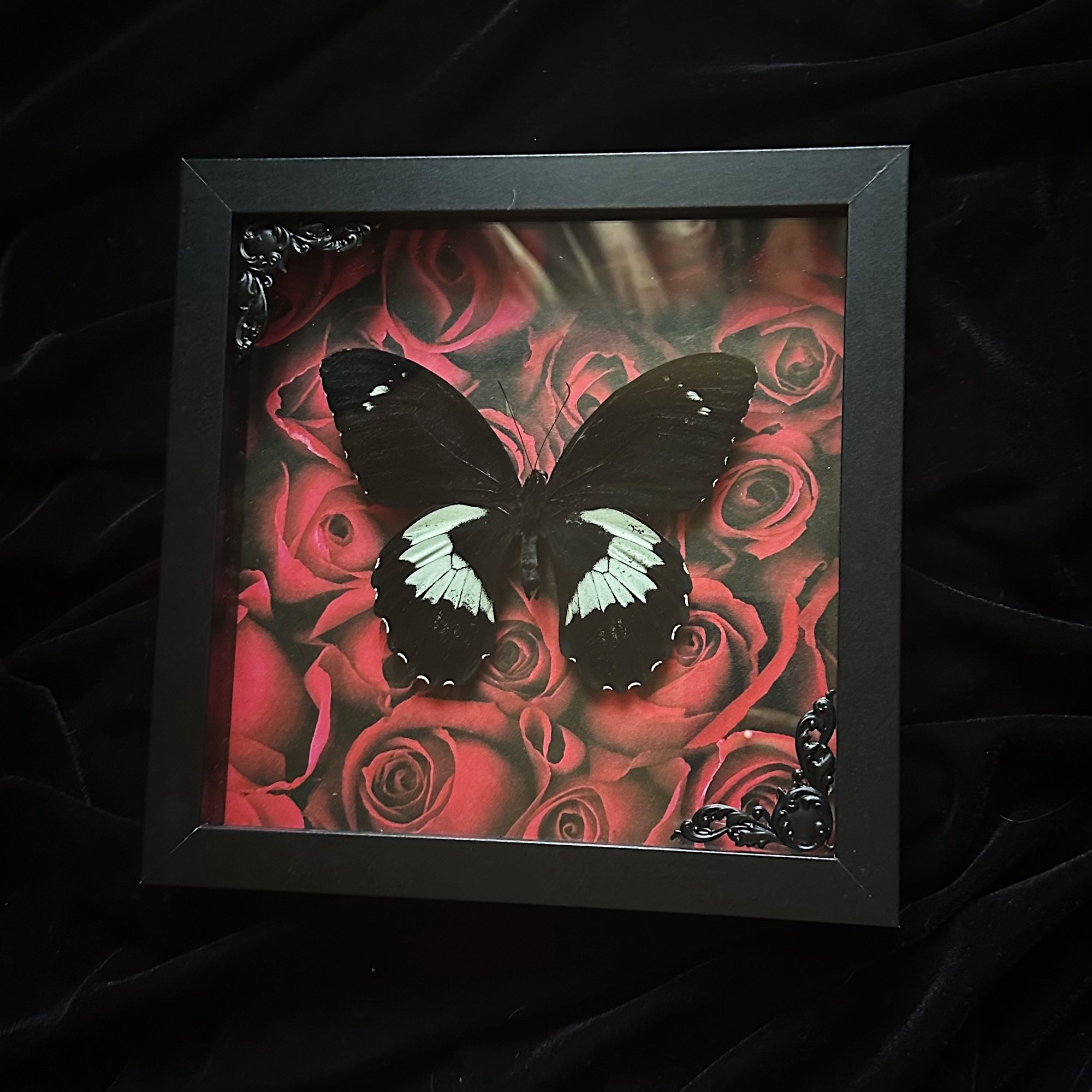 This listing includes a real Papilio Gambrisius Butterfly mounted on a red rose background in an 8x8 shadow box frame with black painted filigree corners.