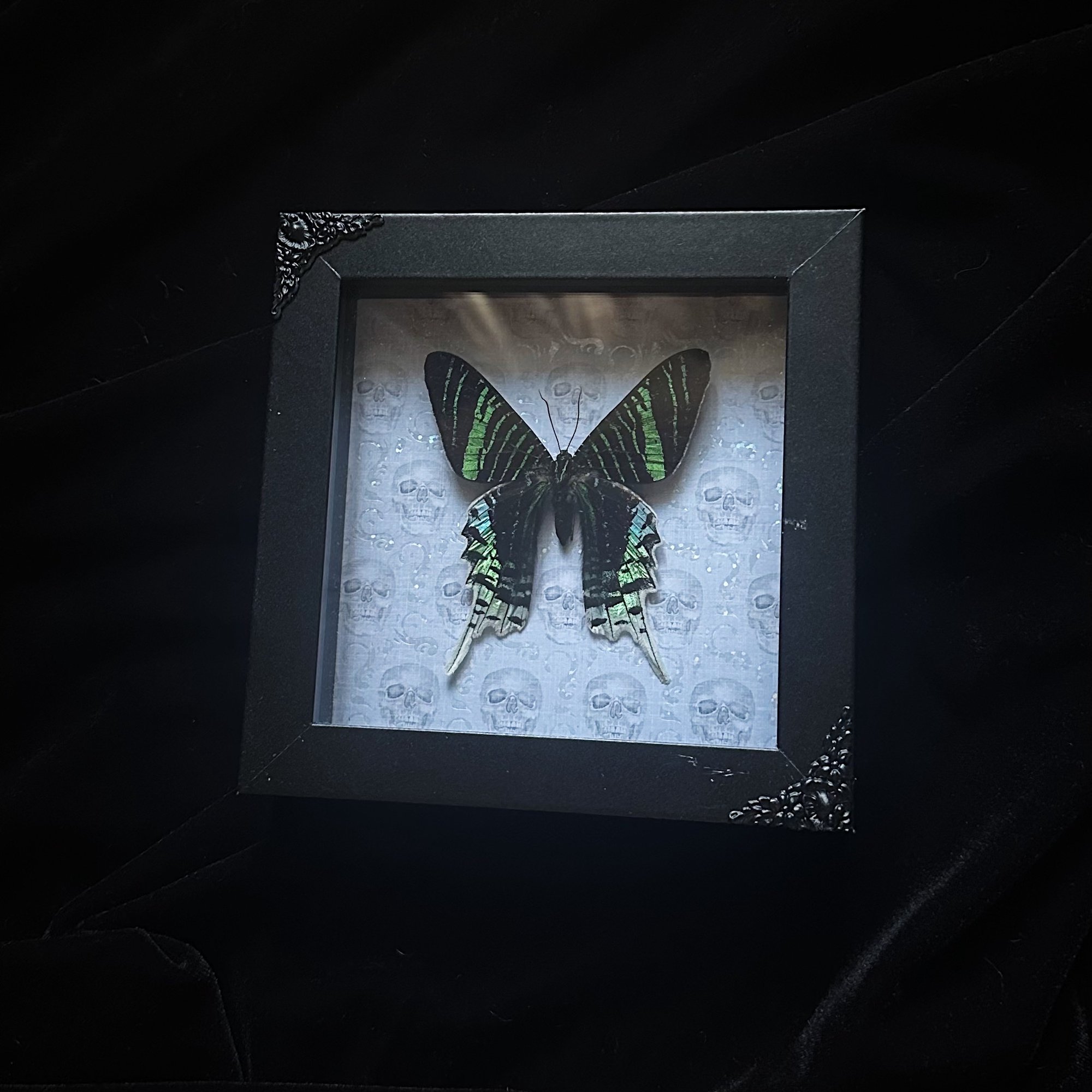 This listing includes a real Urania leilus Moth mounted on a damask and skulls background in a 5x5 shadow box frame with black painted filigree corners.