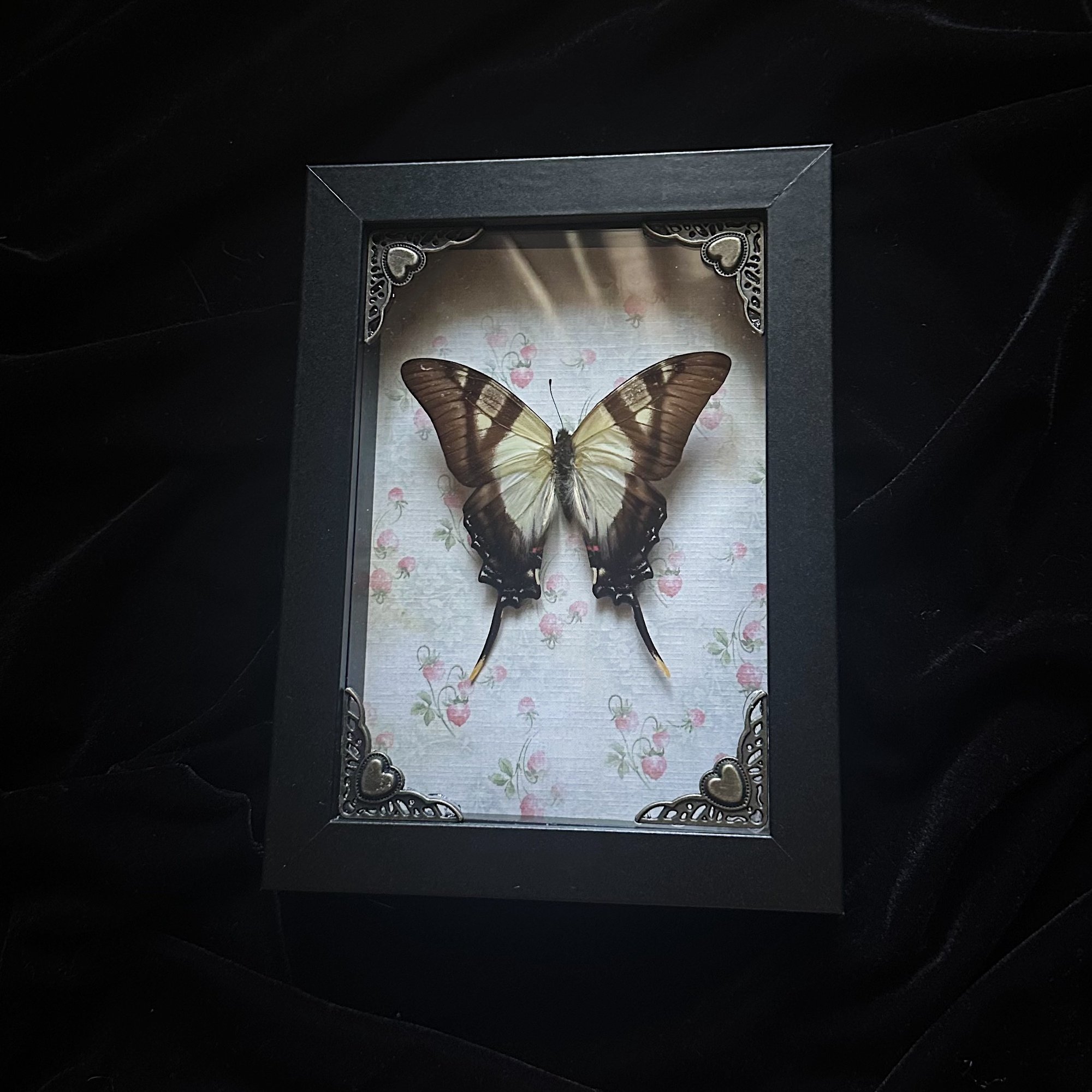 This listing includes a realEurytides serville Swordtail Butterfly mounted on a strawberry floral background in a 5x7 shadow box frame with antique filigree corners.