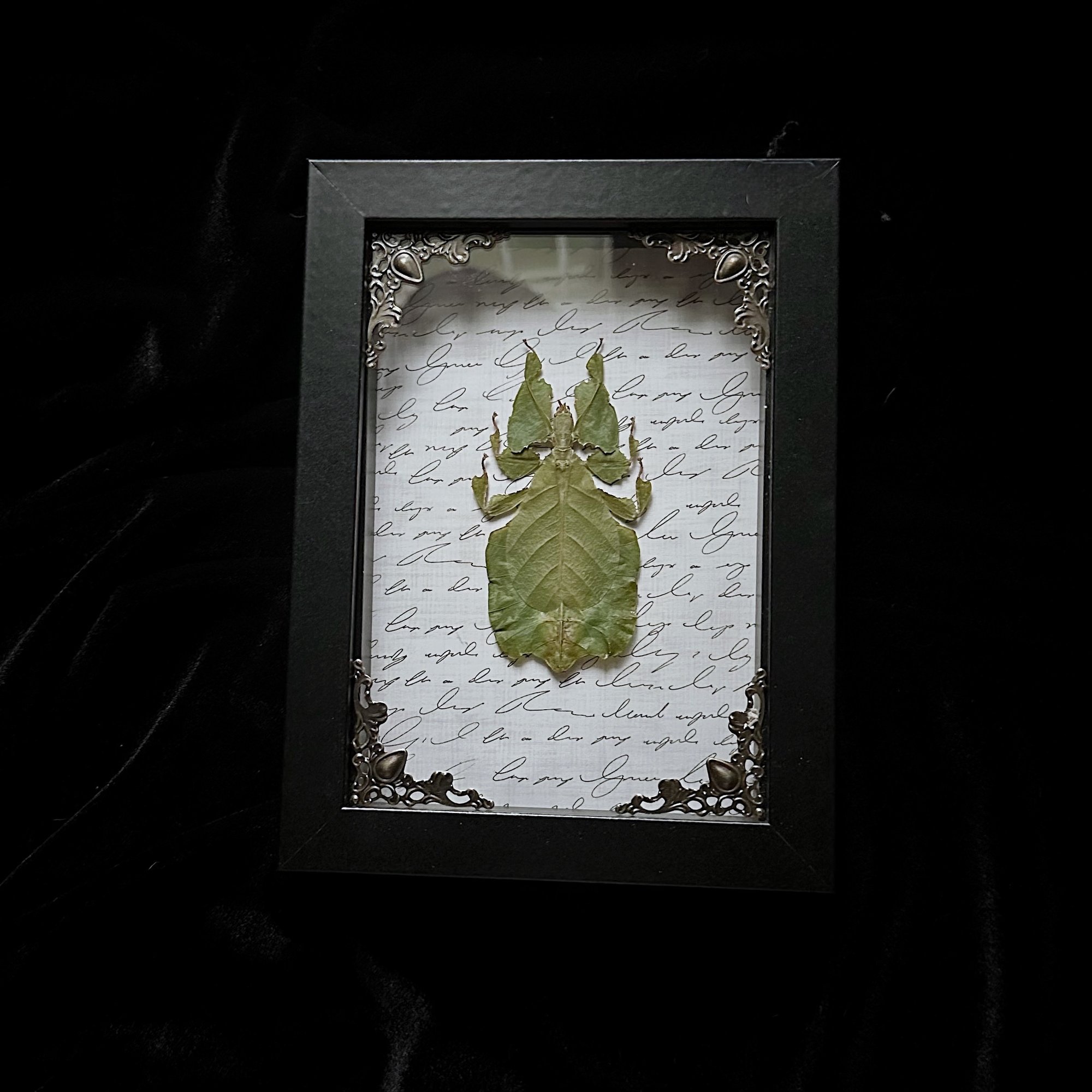 This listing includes a real Phyllium Pulchrifolium Green Leaf Bug mounted on a creme scripted background in a 5x7 shadow box frame with filigree corners.