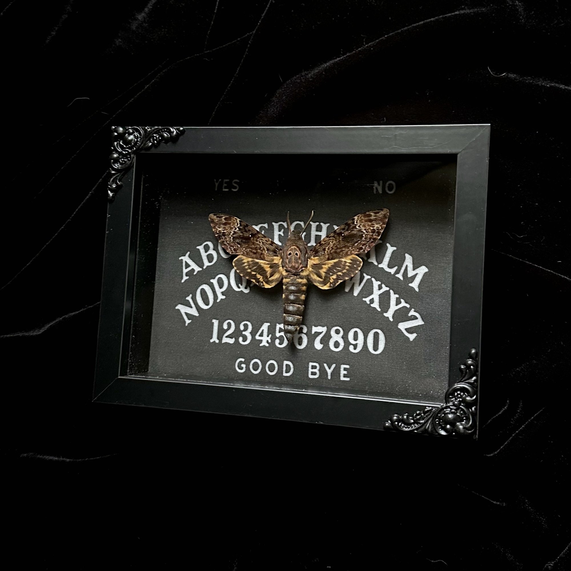 This listing includes a real Death's Head Hawk Moth (Acherontia Lachesis) mounted on a spirit (ouija) board in a 5x7 shadow box frame with black painted filigree corners.