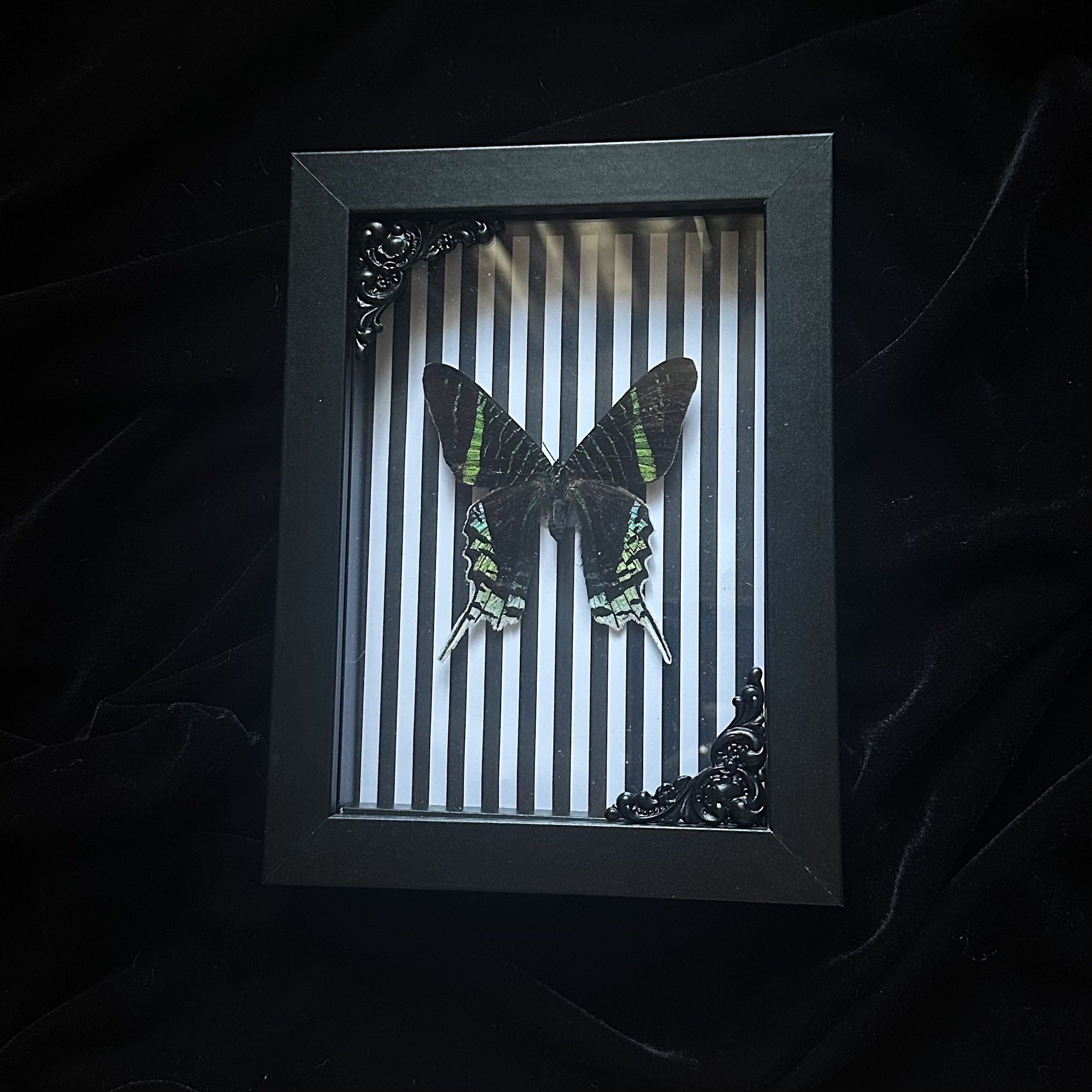 This listing includes a real Urania Leilus Moth mounted on a black and white striped background in a 5x7 shadow box frame with black painted filigree corners.