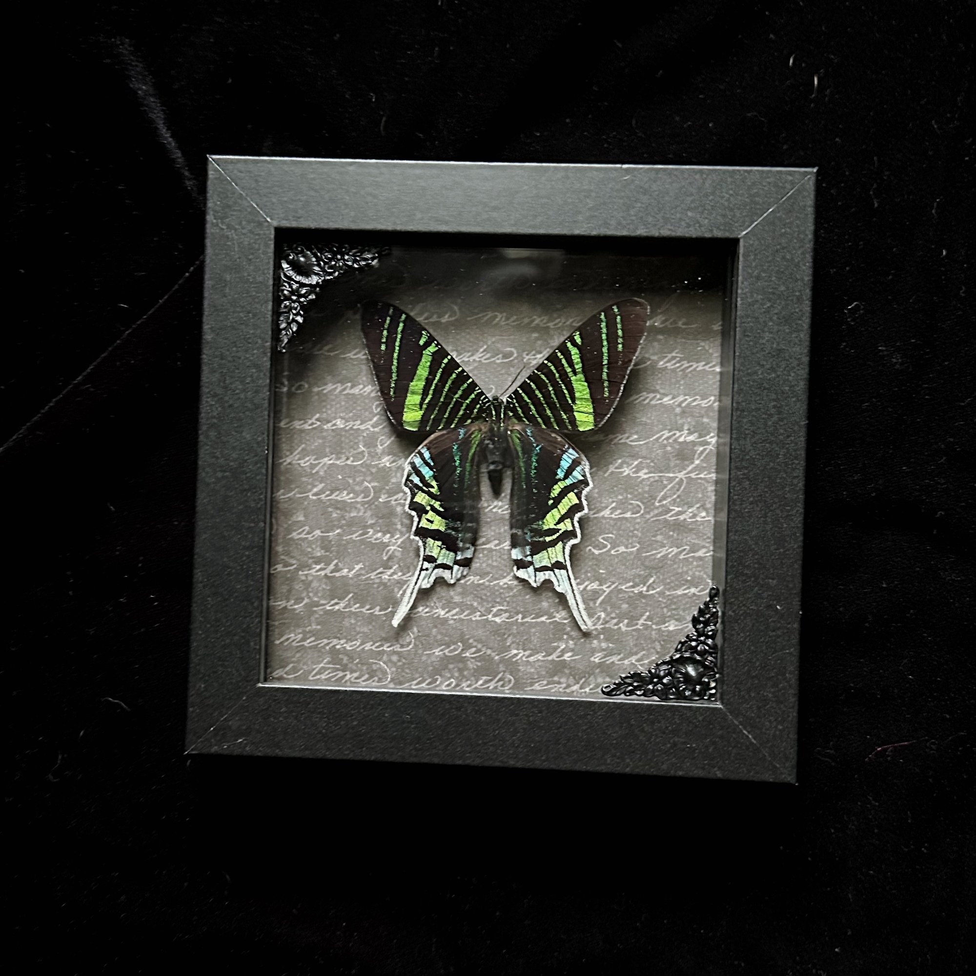 This listing includes a real Urania leilus Moth mounted on a grey scripted background in a 5x5 shadow box frame with black painted filigree corners.