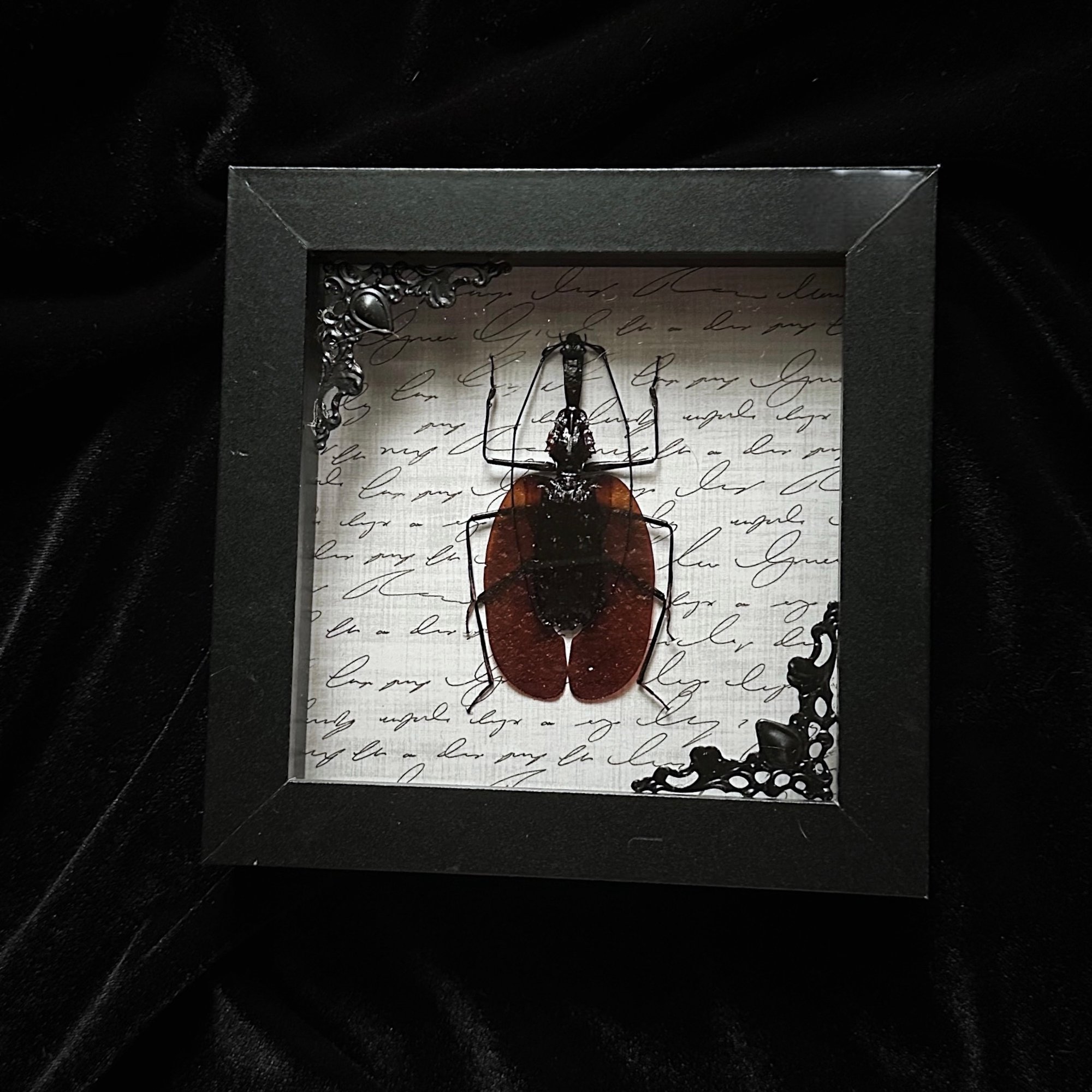 This listing includes a real Mormolyce phyllodes or Violin Beetle mounted on a white script background in a 5x5 shadow box frame.