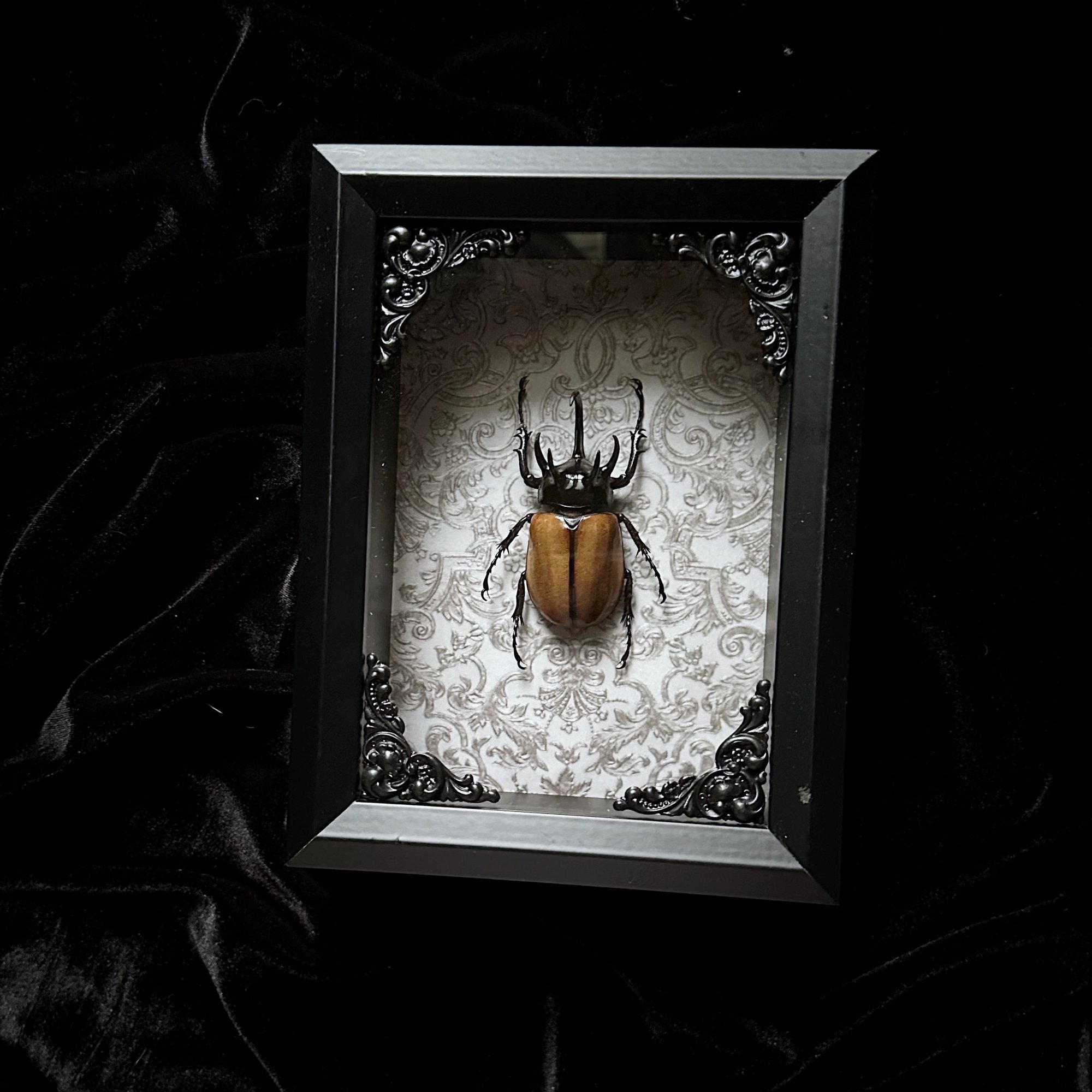 This listing includes a real Yellow five-horned rhinoceros beetle (Eupatorus Gracilicornis) mounted on a white and grey damask background in a 5x7 shadow box frame with filigree corners.