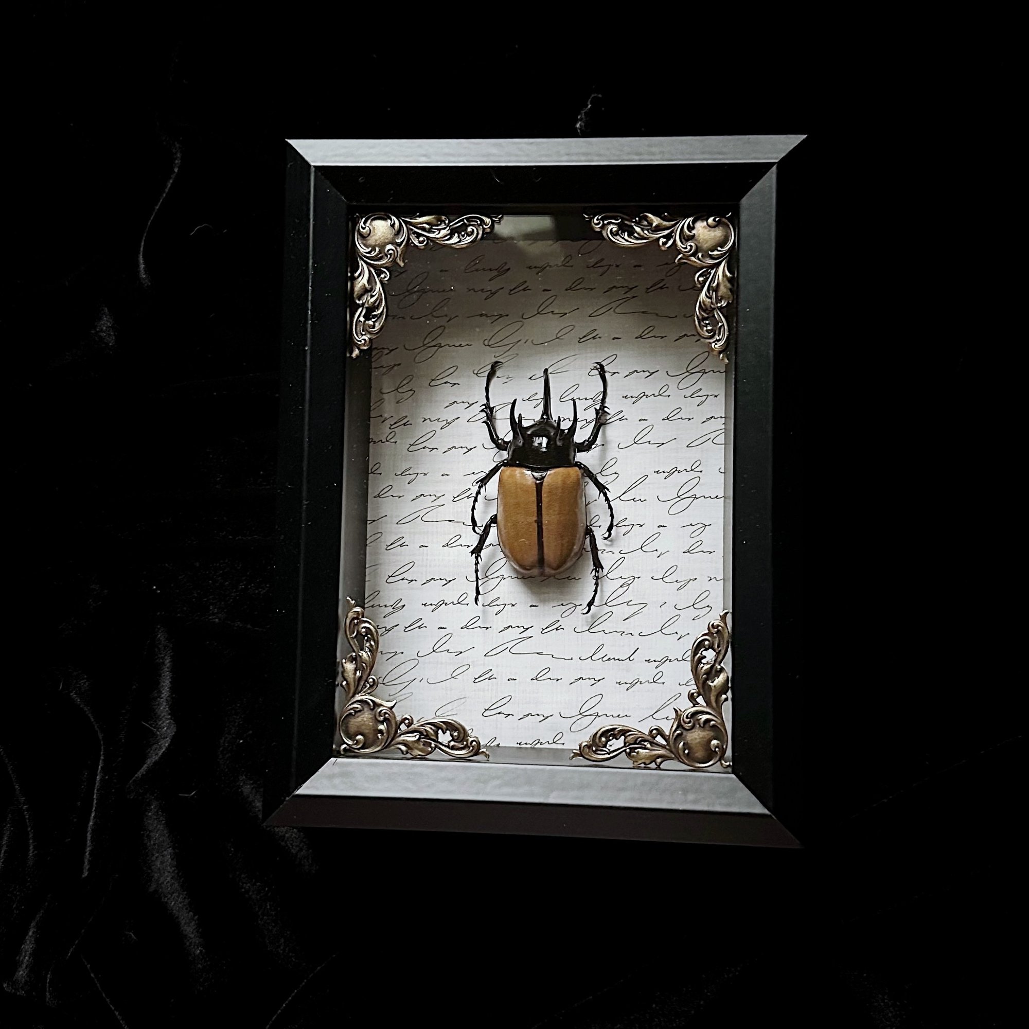 This listing includes a real Yellow five-horned rhinoceros beetle (Eupatorus Gracilicornis) mounted on a creme script background in a 5x7 shadow box frame with filigree corners.